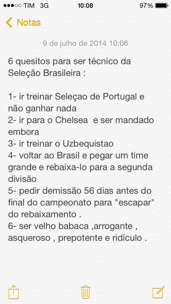 Alemanha sobre o Brasil por 7 a 1 na última terça-feira (8), no Mineirão, em Belo Horizonte. Para o agente, o principal culpado pela derrota foi o treinador Luiz Felipe Scolari. Atráves de seu Twitter, Wagner listou seis quesitos para ser técnico da Seleção Brasileira.